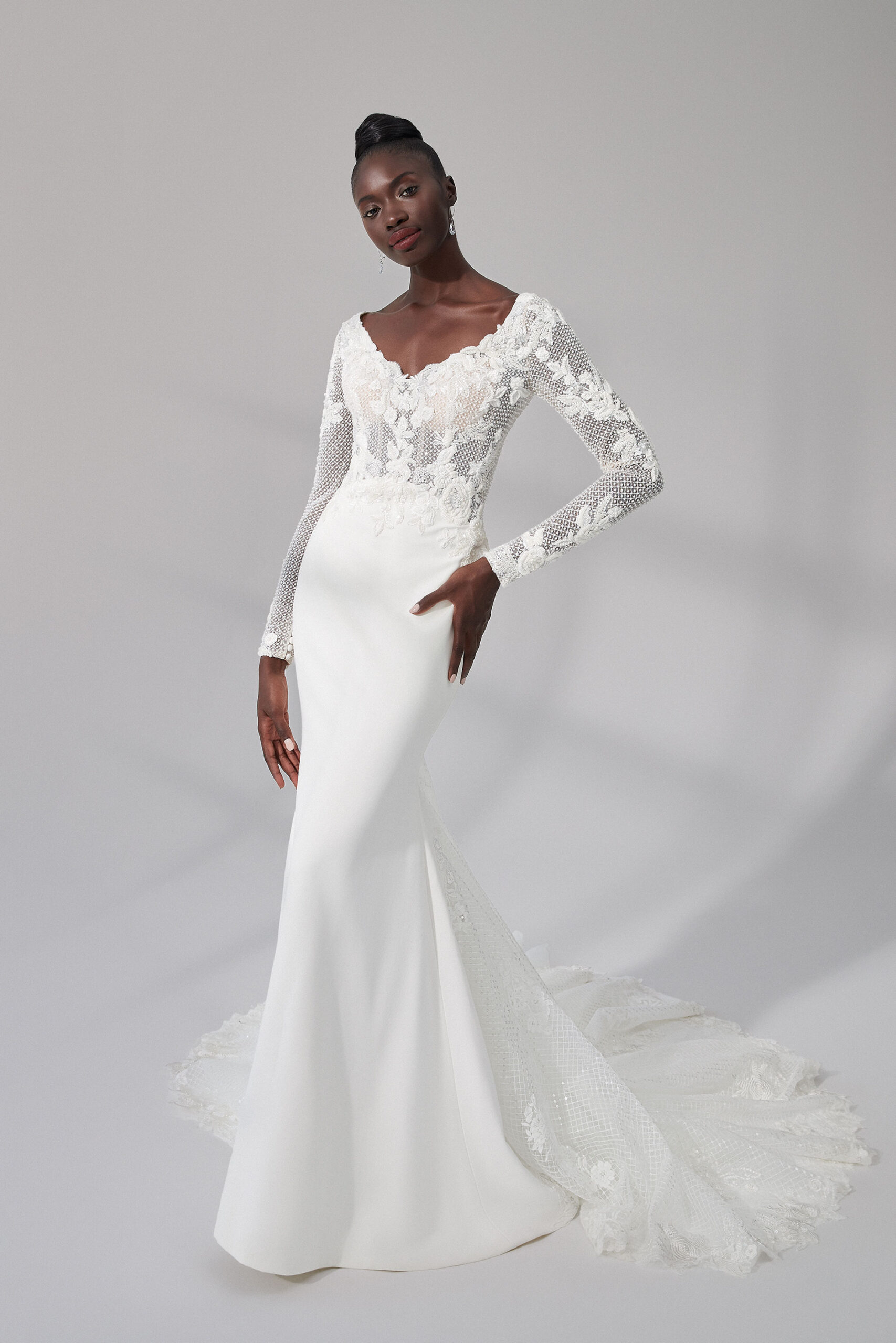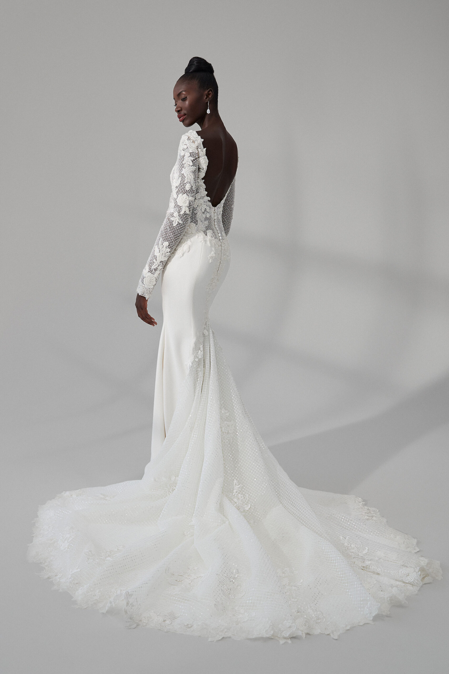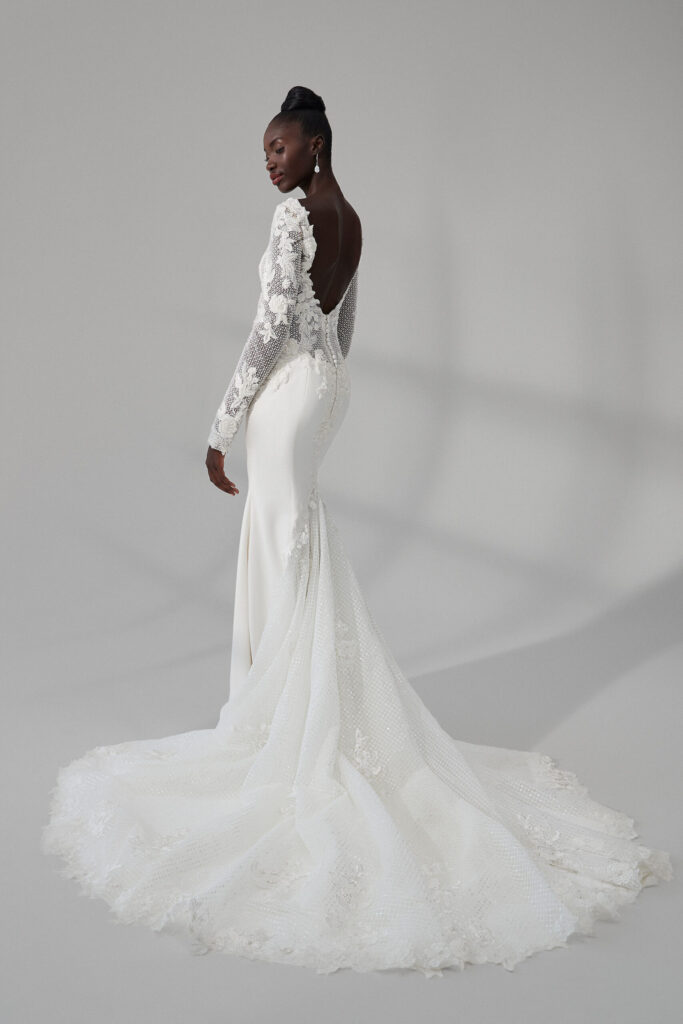 Σατέν νυφικό σε στενή γραμμή με μανίκια και ανοιχτή πλάτη